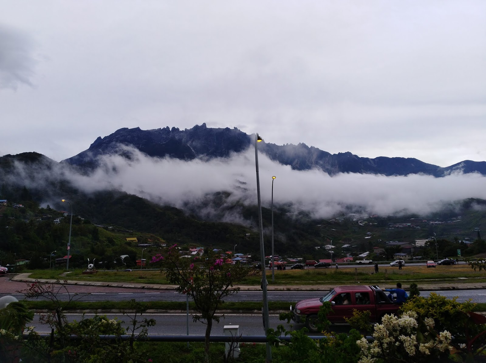 Lalu ternampak chicken wing, lalu beli tapi dalam dilema tamak-tak tamak kami beli sekadarnya ja. Bungkus nasi goreng dua bungkus, bihun goreng dan chicken wing untuk dinner. Air takyah. Jumpa kedai runcit kat area sama terus beli sabun mandi, bekalan jajan dan sebagainya. Masa tunggu chicken wing siap tu tadaaa kabus hilang sikit demi sikit dapat la tengok Gunung Kinabalu di hari pertama sampai Sabah. Yeay!
